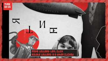 Help a boy deconstruct a propaganda poster by moving and rotating the words to free himself at the top right-hand corner of the poster.